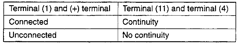 1. Connect the negative (-) terminal of the 1.5 V power supply to terminal (4) of the ignition power transistor, and then check whether there is continuity between terminal (11) and terminal (4) when terminal (1) and the positive (+) terminal are connected and disconnected.