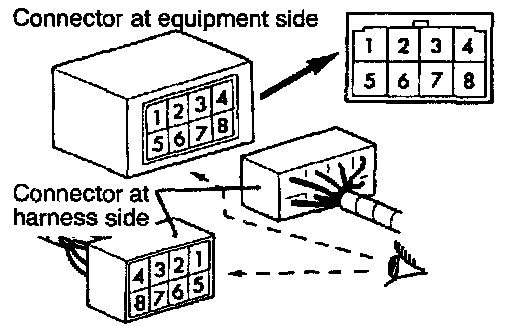 - When a connector is disconnected in order to check terminal voltage, etc., never insert a probe if the terminal to be checked is a female pin, because the forceful insertion of a probe will cause improper or incomplete contact.
