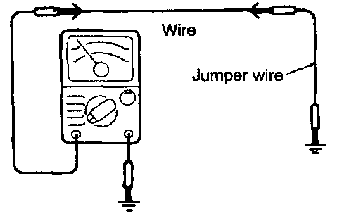 - When checking for damaged or disconnected wiring of a harness (open circuit) and if both ends of the harness are unconnected, use a jumper wire to ground one end of the harness, and then check for continuity between the other end and ground. By doing this, you can check for damaged or disconnected wiring, and, if there is no continuity, the harness should be repaired.