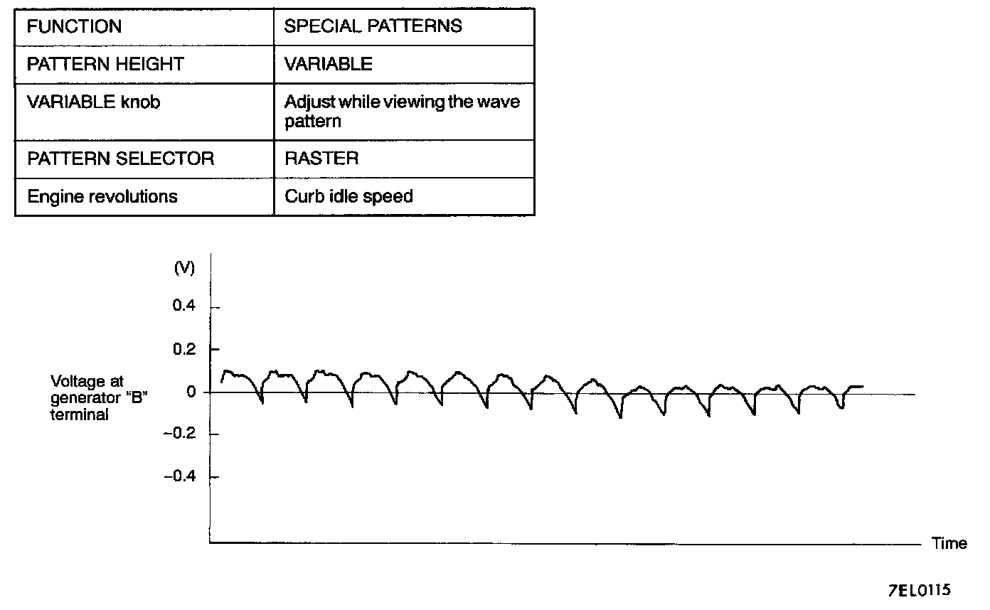 NOTE: Furthermore, the voltage waveform of the generator "B" terminal can undulate as shown. This waveform is produced when the regulator operates according to fluctuations in the generator load (current), and is normal for the generator.