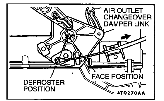 2. Set the air outlet changeover damper link of the heater unit to the defroster position as shown in the illustration, and then connect the cable to the link pin.