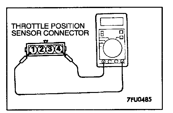 1. Disconnect the throttle position sensor connector.2. Measure the resistance between the throttle position sensor side connector terminal 1 and terminal 4.