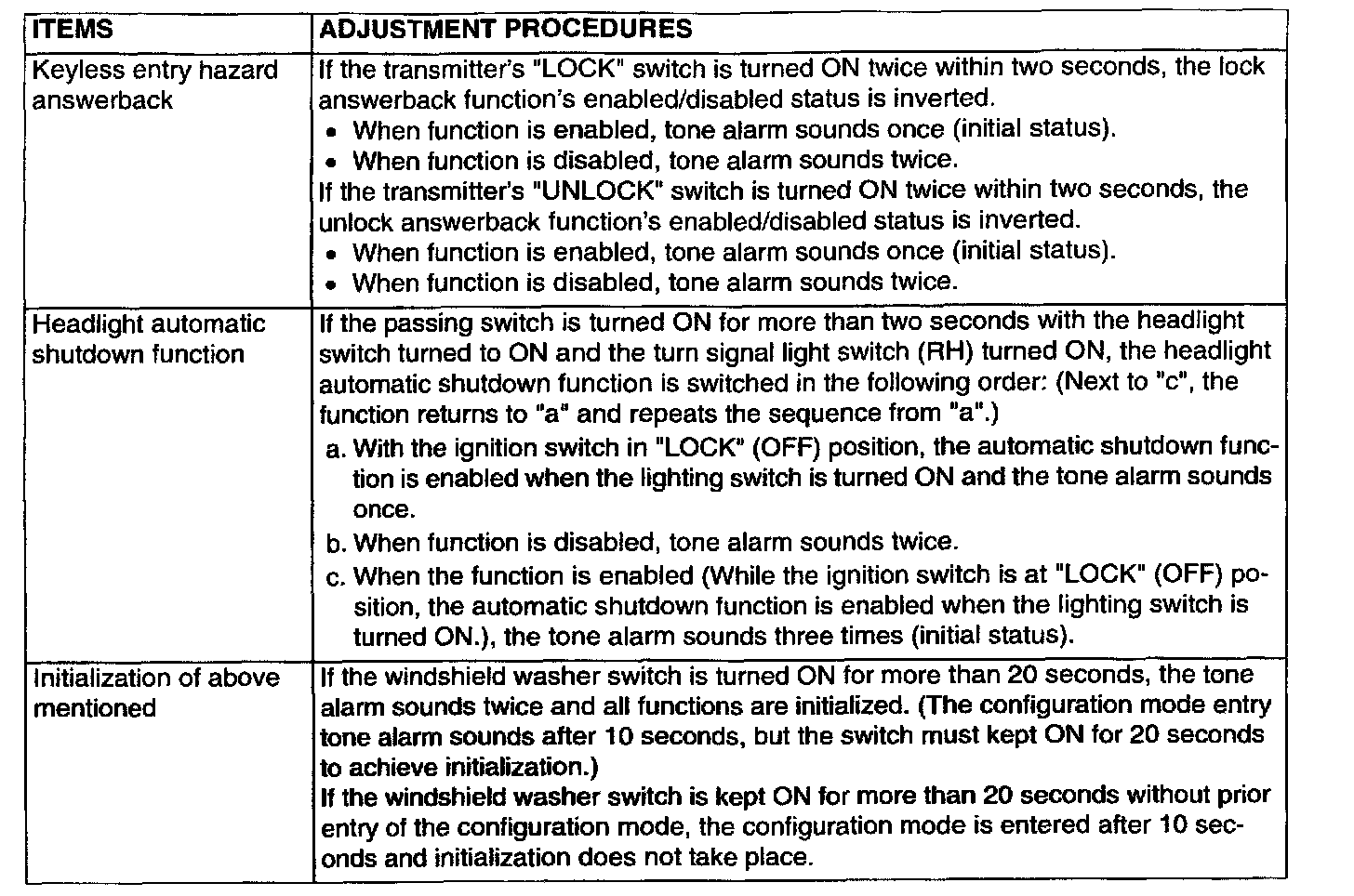 NOTE: The keyless entry hazard answerback can also be adjusted by operating the RKE transmitter. (The operating method using the transmitter is easier.) Refer to Keyless Entry System - On-vehicle Service - Enabling/Disabling the Answerback Function.
