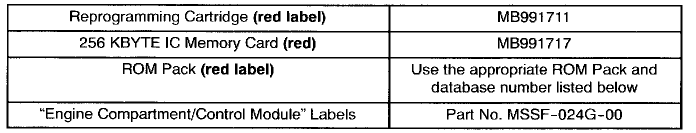 6. Install the red label reprogramming cartridge to the MUT-II. Then install the 256 KBYTE red memory card and the red label ROM pack. Use the ROM pack with the appropriate database number.