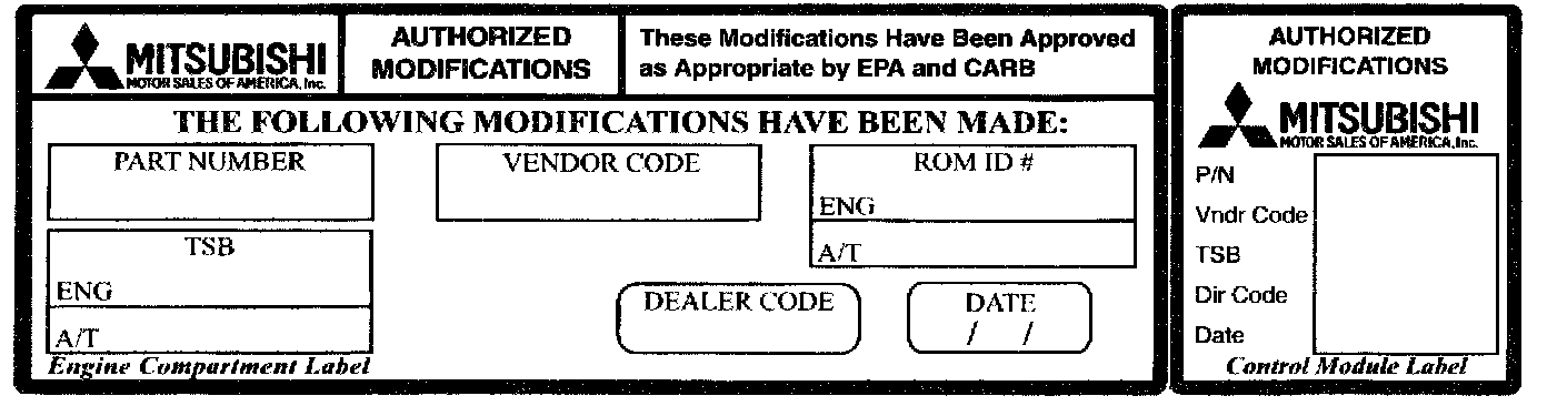 16. Using a ball-point pen, enter the appropriate PCM part number, ROM ID #, this TSB number (TSB-03-13-001), your dealer code, and the current date on the Engine Compartment label and Control Module label (part no. MSSF-024G-00).
