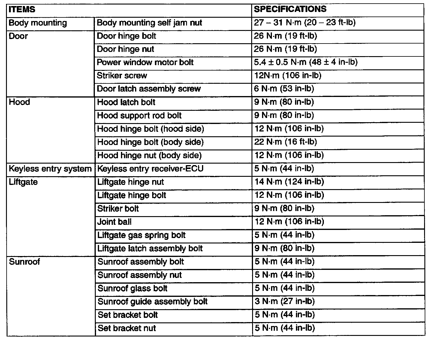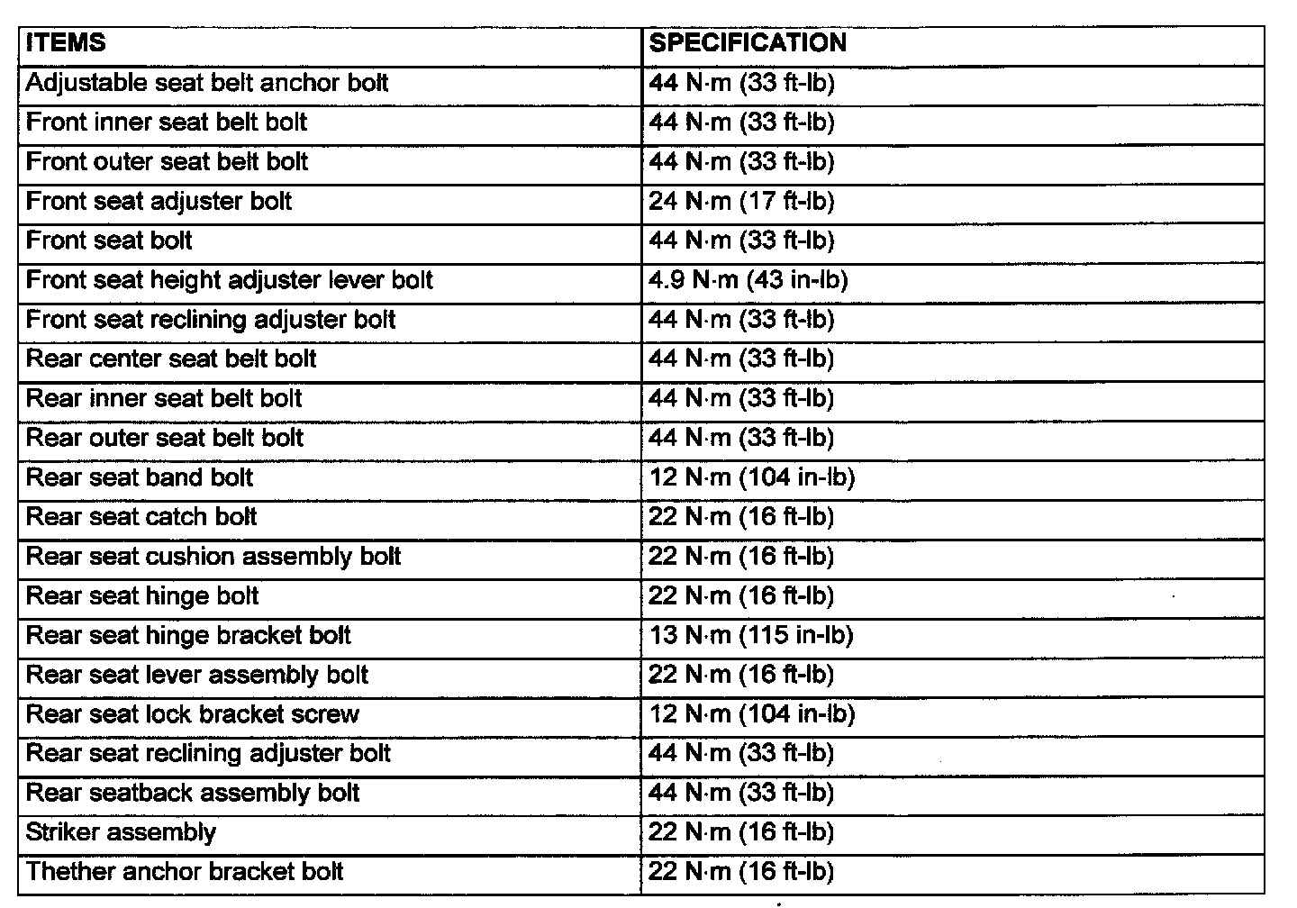 Fastener Tightening Specifications: