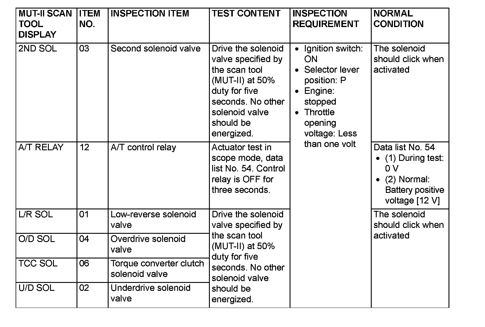 Actuator Test Reference Table
