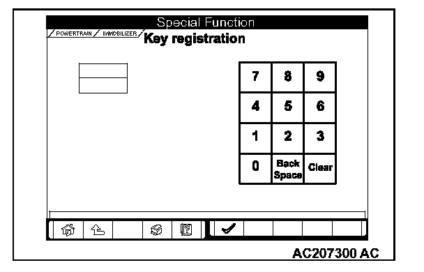 8. Enter the vehicle's password (secret code) on the "Key registration" screen, and then click the check mark icon. Follow the prompts on the screen to insert key(s) into the ignition switch to begin key registration.