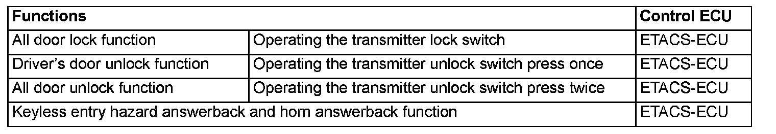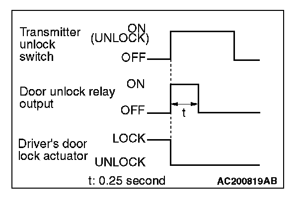 When the transmitter unlock switch is pressed once, the ETACS-ECU energizes its door unlock relay to operate the door lock actuator of the driver's door for 0.25 seconds thus causing only the driver's door to be unlocked.