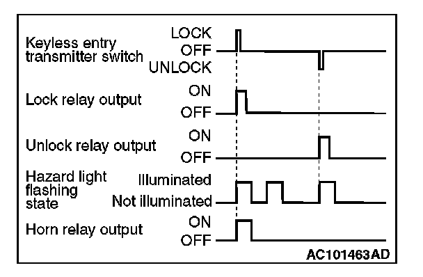 The hazard answerback and horn answerback function which facilities checking of lock or unlock operations even during daytime is provided. When the lock signal is input from the keyless entry transmitter to the ETACS-ECU, the hazard light flashes twice and horn sounds once. When the unlock signal is input,hazard light flashes once.