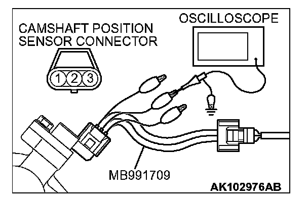 1. Disconnect the camshaft position sensor connector, and connect the test harness special tool (MB991709) between the separated connector. (All terminals should be connected.)