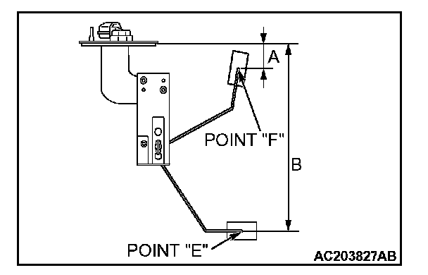1. Move the float and measure height A at point "F" (highest) and B at point "E" (lowest) with the float arm touching stopper.