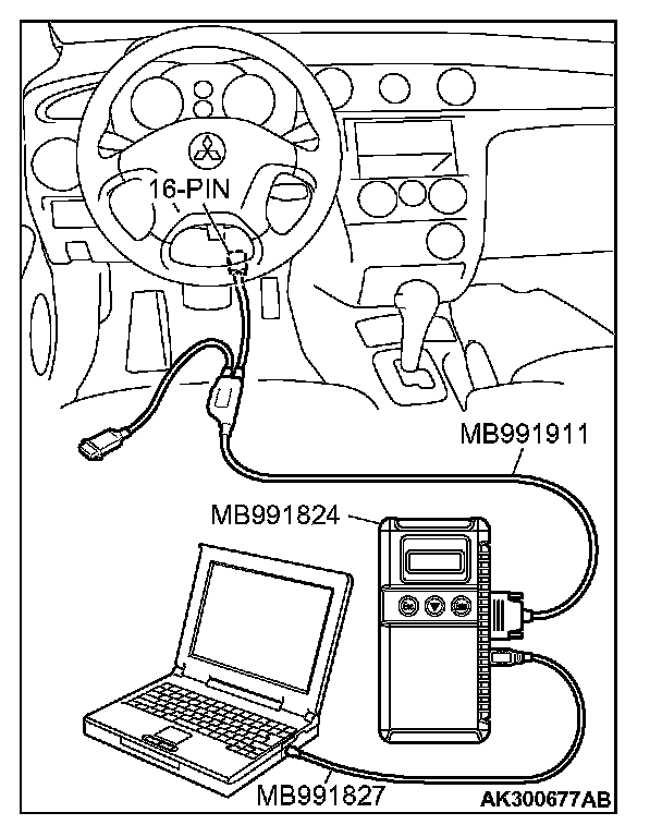 CAUTION: To prevent damage to scan tool MB991958, always turn the ignition switch to the "LOCK" (OFF) position before connecting or disconnecting scan tool MB991958.