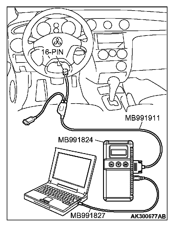 CAUTION: To prevent damage to scan tool MB991958, always turn the ignition switch to the "LOCK" (OFF) position before connecting or disconnecting scan tool MB991958.
