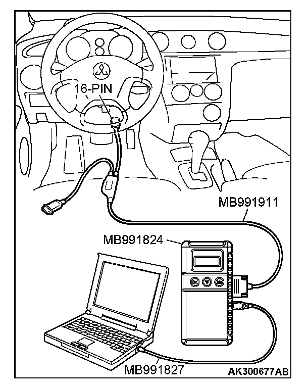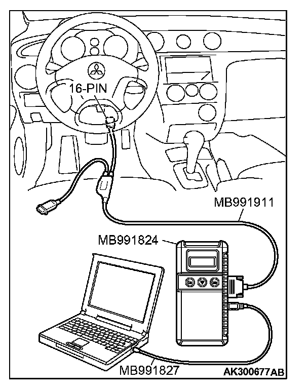 CAUTION: To prevent damage to scan tool MB991958, always turn the ignition switch to the "LOCK" (OFF) position before connecting or disconnecting scan tool MB991958.