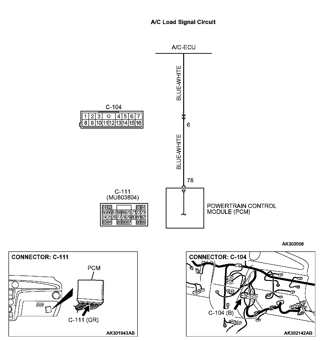 - The A/C-ECU detects how the air conditioning is applying load to the engine, and converts the information to a voltage signal (High voltage = low load, Low voltage = high load). This voltage signal is called "A/C load signal". The PCM receives this A/C load signal from the A/C-ECU through terminal No. 78, and determines the idle-up speed according to the high or low air conditioning load.