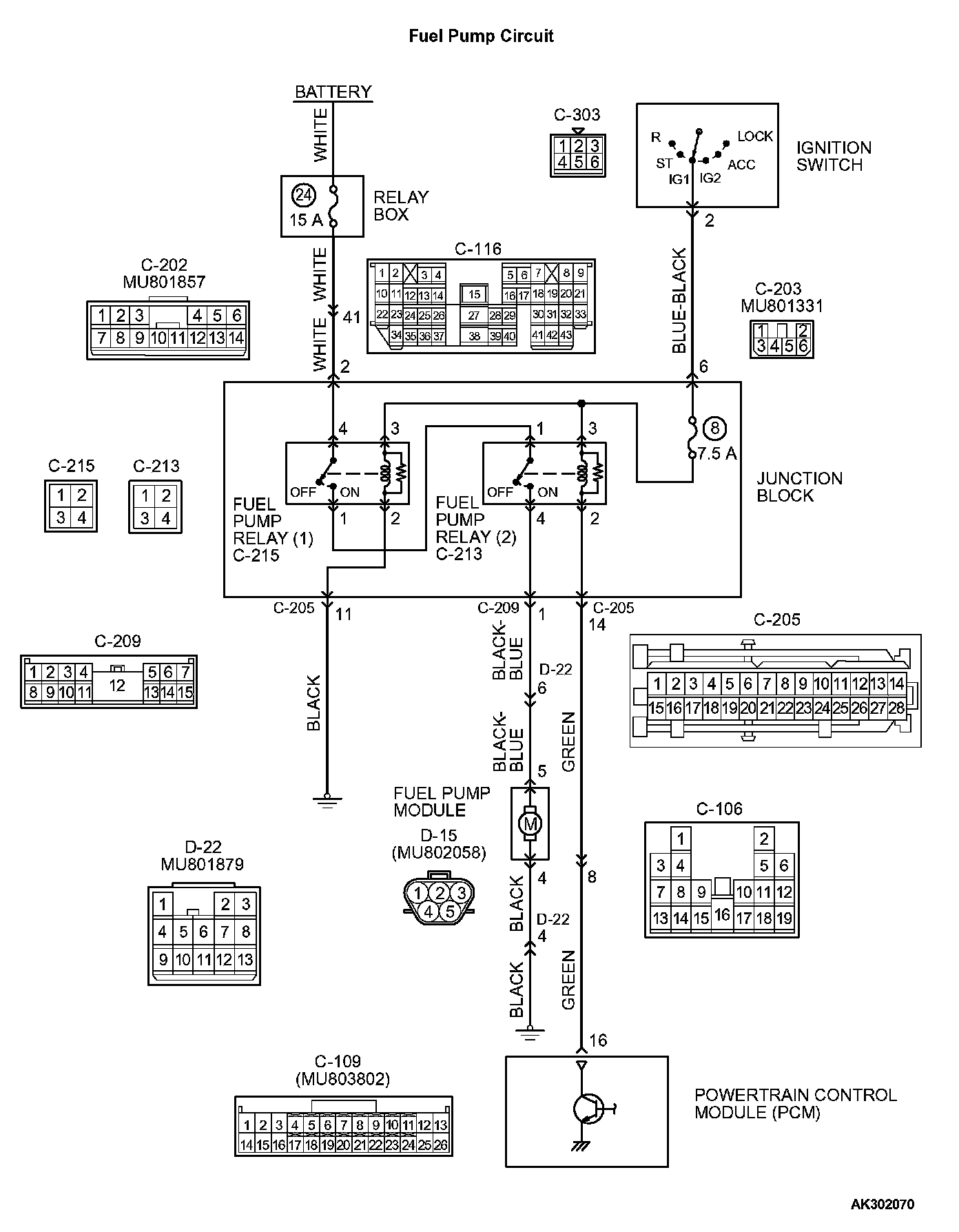 - Battery positive voltage is applied to the fuel pump relay 1 (terminal No. 3) from the ignition switch-IG.Ground is provided through terminal No. 2 to chassis ground.