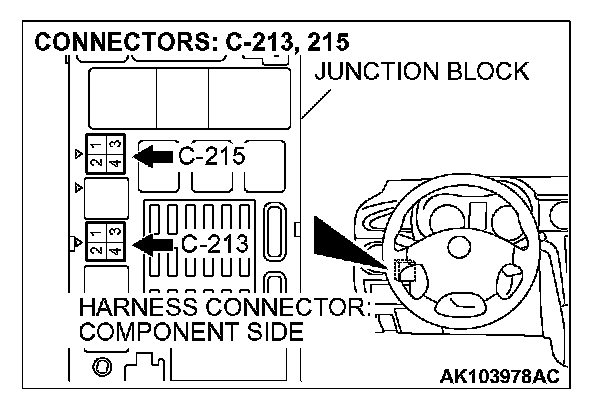 STEP 2. Check harness connector C-215 at fuel pump relay 1 and harness connector C-213 at fuel pump relay 2 for damage.