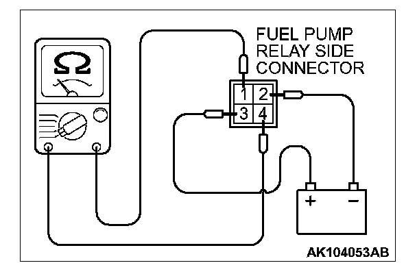 4. Check for continuity between the each fuel pump relay terminals No. 1 and No. 4 while connecting and disconnecting the jumper wire at the negative battery terminal.