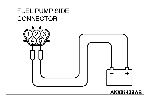 2. Use jumper wires to connect fuel pump connector terminal No. 5 to the positive battery terminal and terminal No. 4 to the negative battery terminal.