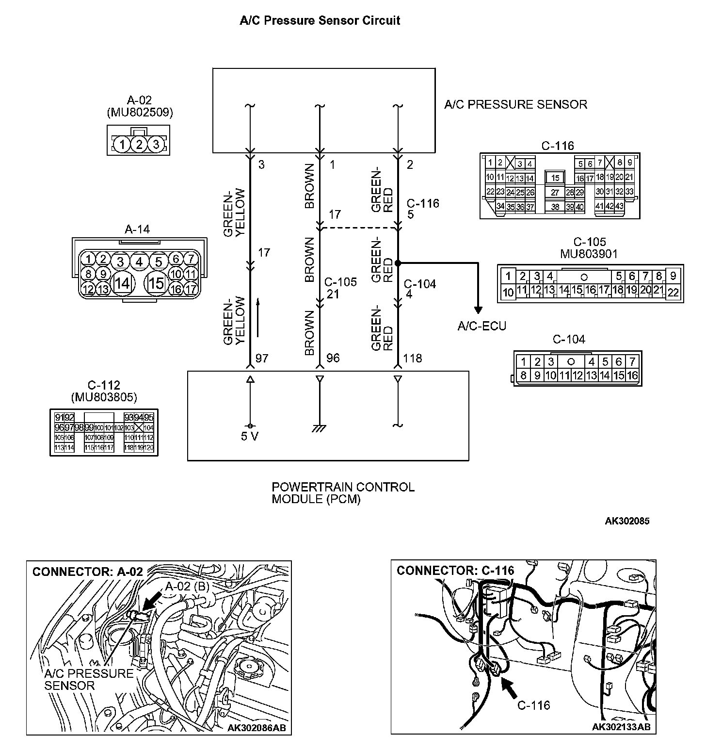 - A 5-volt voltage is supplied to the A/C pressure sensor power terminal (terminal No. 3) from the PCM (terminal No. 97). The ground terminal (terminal No. 1) is grounded with the PCM (terminal No. 96).