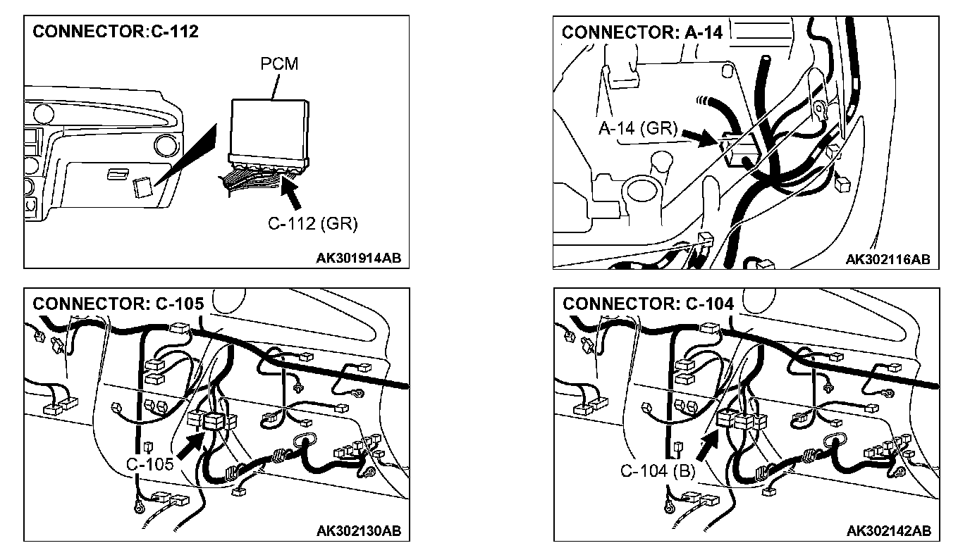 STEP 14. Check harness connector C-112 at PCM and harness connector A-02 at A/C pressure sensor for damage.