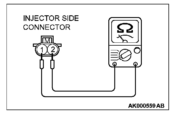 2. Measure the resistance between each injector side connector terminal No. 1 and No. 2.
