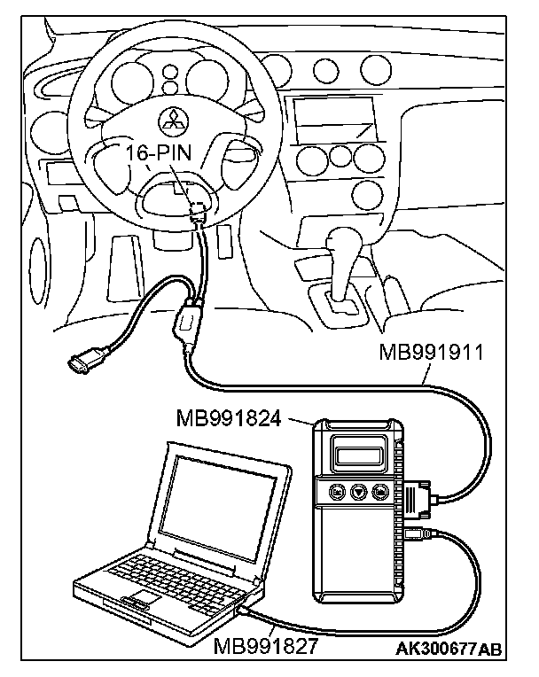 CAUTION: To prevent damage to scan tool MB991958, always turn the ignition switch is to the "LOCK" (OFF) position before connecting or disconnecting scan tool MB991958.