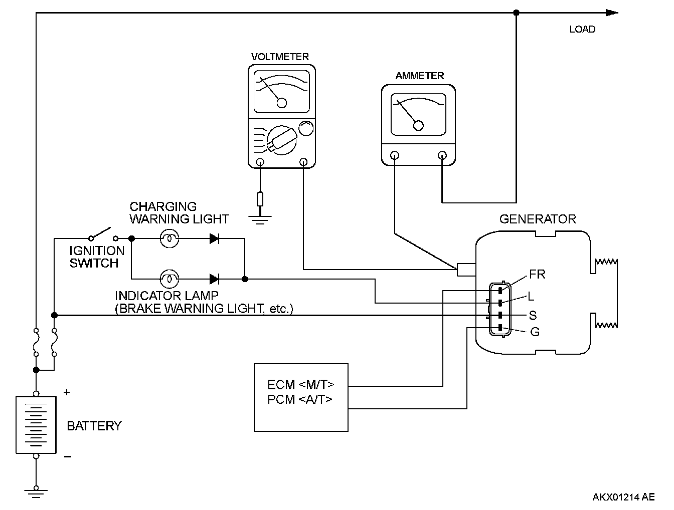 NOTE: If the electrical load is small while testing, the specified level of current may not be output even though the generator is normal. In such cases, increase the electrical load by leaving the headlights turned on for some time to discharge the battery or by using the lighting system in another vehicle, and then test again.