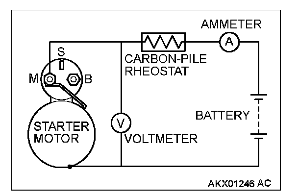 2. Connect a test ammeter (100-ampere scale) and carbon pile rheostat in series between the positive battery terminal and starter motor terminal.