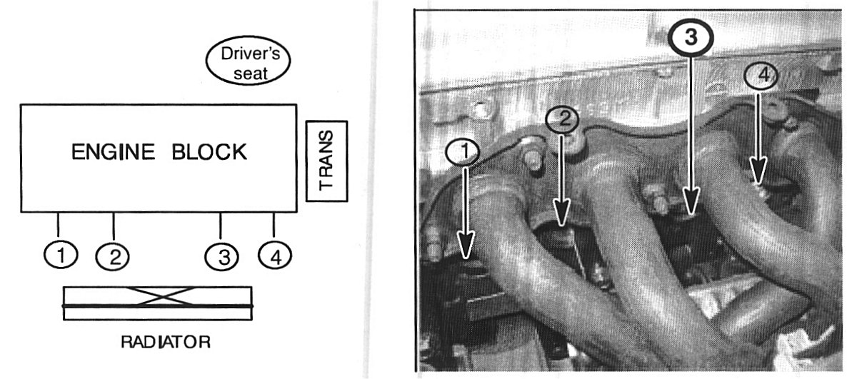 1. Remove the core plug identified below as (3). This core plug must be removed to prevent possible coolant flow blockage. Do not attempt to install the block heater in a different core plug location.