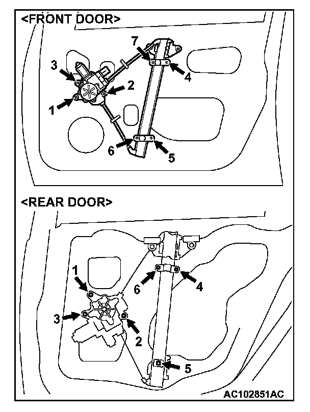 When installing the window regulator assembly, tighten the bolts to the specified torque in the order shown.