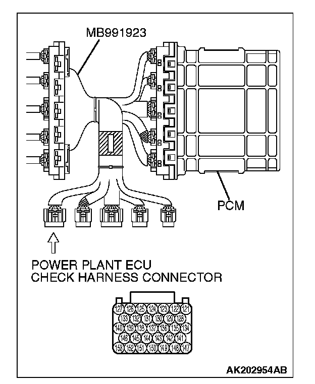 1. Disconnect the all PCM connectors, and connect check harness special tool (MB991923) between the separated connectors.