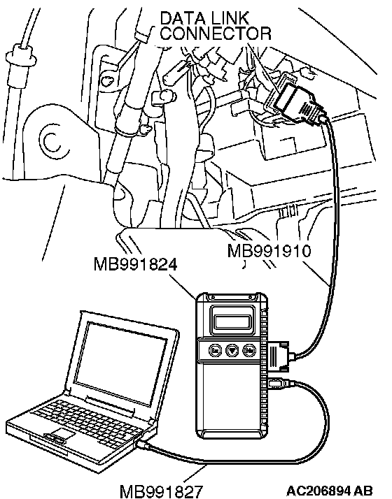 CAUTION: To prevent damage to scan tool MB991958, always turn the ignition switch to the "LOCK" (OFF) position before connecting or disconnecting scan tool MB991958.