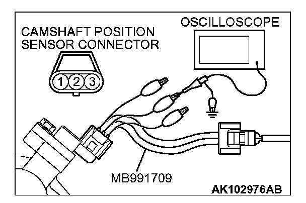 1. Disconnect the camshaft position sensor connector, and connect the test harness special tool (MB991709) between the separated connector. (All terminals should be connected.)