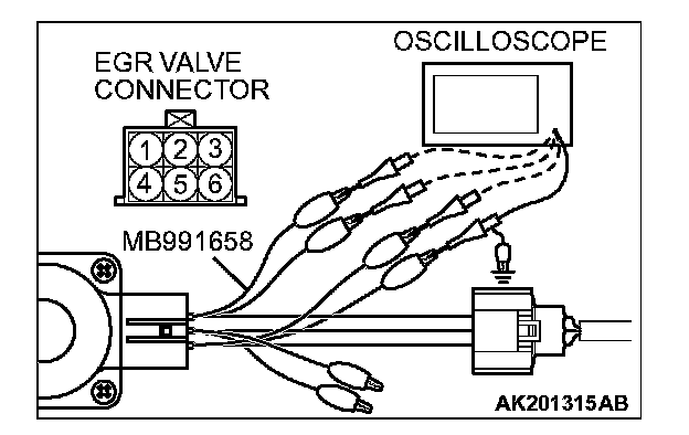 2. Connect the oscilloscope probe to the EGR valve connector terminal No. 1, terminal No. 3, terminal No. 4, No. terminal 6 respectively.