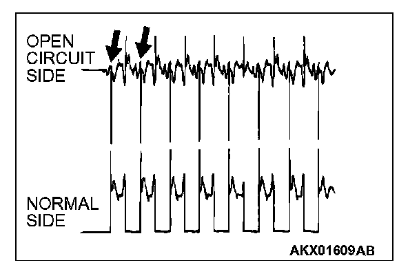 - Current is not supplied to the motor coil on the open circuit side. (Voltage does not drop to 0 volt.) Furthermore, the induced electromotive force wave pattern at the normal side is slightly different from the normal wave pattern.