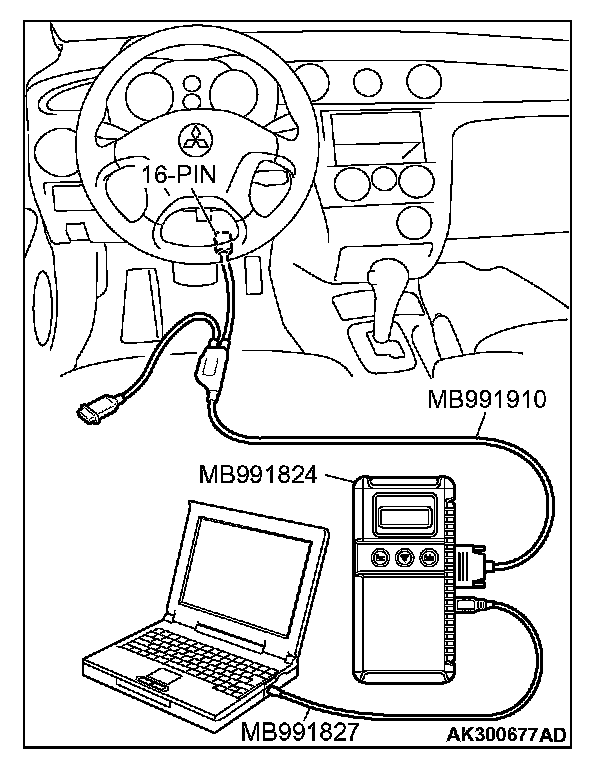 CAUTION: To prevent damage to scan tool MB991958, always turn the ignition switch to the "LOCK" (OFF) position before connecting or disconnecting scan tool MB991958.