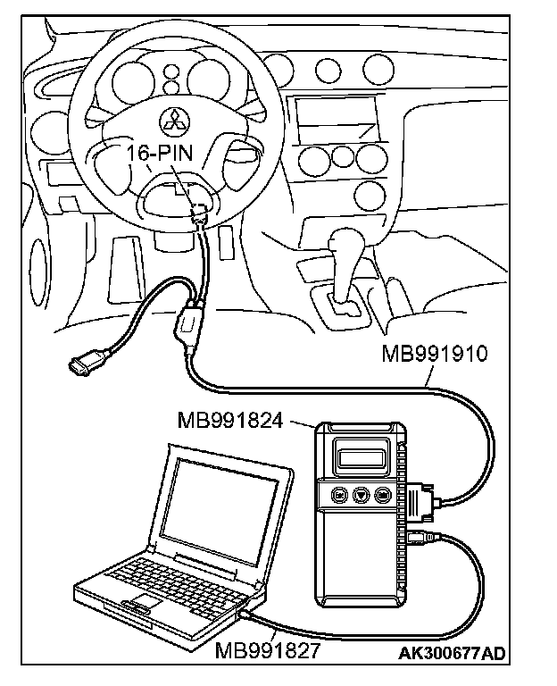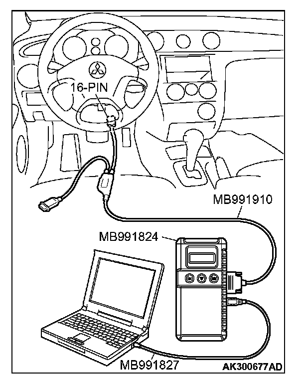 CAUTION: To prevent damage to scan tool MB991958, always turn the ignition switch to the "LOCK" (OFF) position before connecting or disconnecting scan tool MB991958.