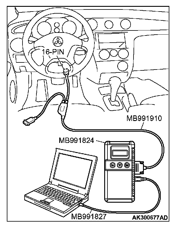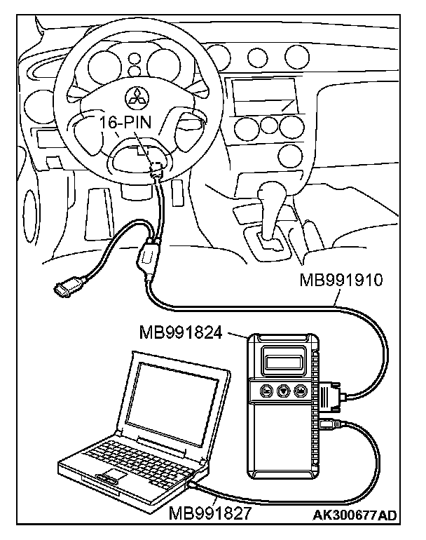 CAUTION: To prevent damage to scan tool MB991958, always turn the ignition switch to the "LOCK" (OFF) position before connecting or disconnecting scan tool MB991958.