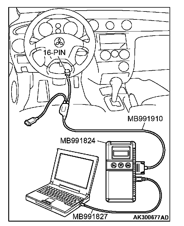 CAUTION: To prevent damage to scan tool MB991958, always turn the ignition switch to the "LOCK" (OFF) position before connecting or disconnecting scan tool MB991958.
