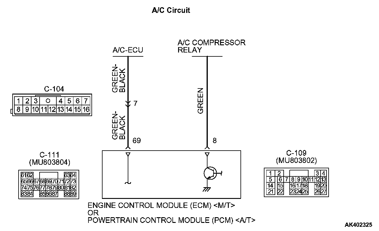 - When the A/C is "ON", the battery positive voltage is applied on the ECM or the PCM (terminal No. 69) from the A/C-ECU. When battery positive voltage is applied to the ECM or the PCM , the ECM or the PCM turns "ON" the power transistor in the ECM or the PCM . The ECM or the PCM delays A/C engagement momentarily while it increases idle r/min. Then the A/C compressor clutch relay coil will be energized. With this, the A/C compressor clutch relay turns "ON", and the A/C compressor clutch operates.