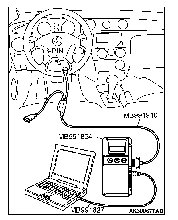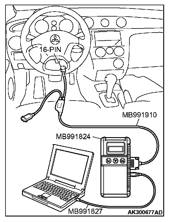 CAUTION: To prevent damage to scan tool MB991958, always turn the ignition switch to the "LOCK" (OFF) position before connecting or disconnecting scan tool MB991958.