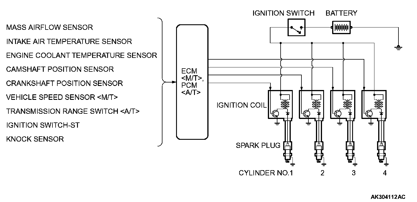 The engine control module (ECM) or powertrain control module (PCM) controls the four ignition power transistors to turn them alternately ON and OFF. This causes the primary currents in the ignition coils to be alternately interrupted and allowed to flow to fire the cylinders in the order 1-3-4-2.