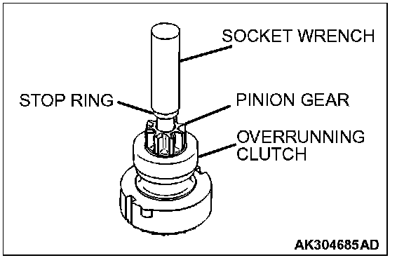 1. Press a long socket wrench to the stop ring. Then tap the socket wrench to remove the stop ring to the pinion gear side.