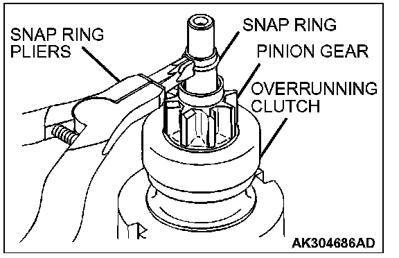 2. After removing the snap ring (by using snap-ring pliers), remove the stop ring and the overrunning clutch.