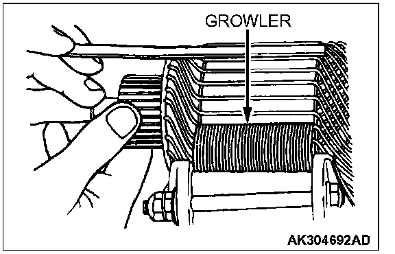 3. Hold a thin steel blade parallel and just above the armature while slowly rotating in the growler. A shorted armature will cause a blade to vibrate and be attracted to the core. Replace the shorted armature.
