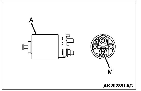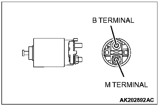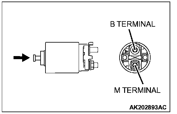 - Push the indicated end of the magnetic switch with a strong force to close the internal contacts. Without releasing the switch end, check that there is continuity between the B terminal and M terminal.