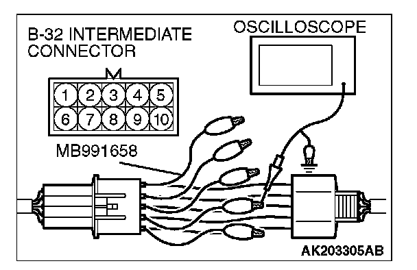 1. Disconnect the intermediate connector B-32, and connect the test harness special tool (MB991658) between the separated connector.