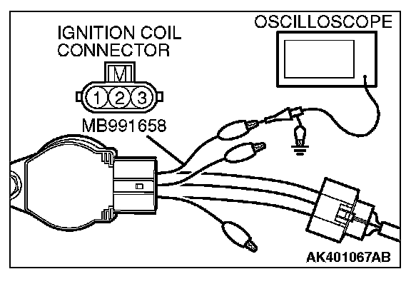 1. Disconnect the ignition coil connector, and connect test harness special tool (MB991658) between the separated connector. (All terminals should be connected.)
